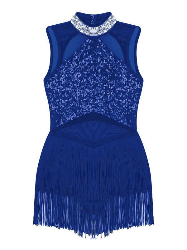 Sleeveless and round collar, shiny rhinestone decorated collar, sequins patchwork style spandex mesh.