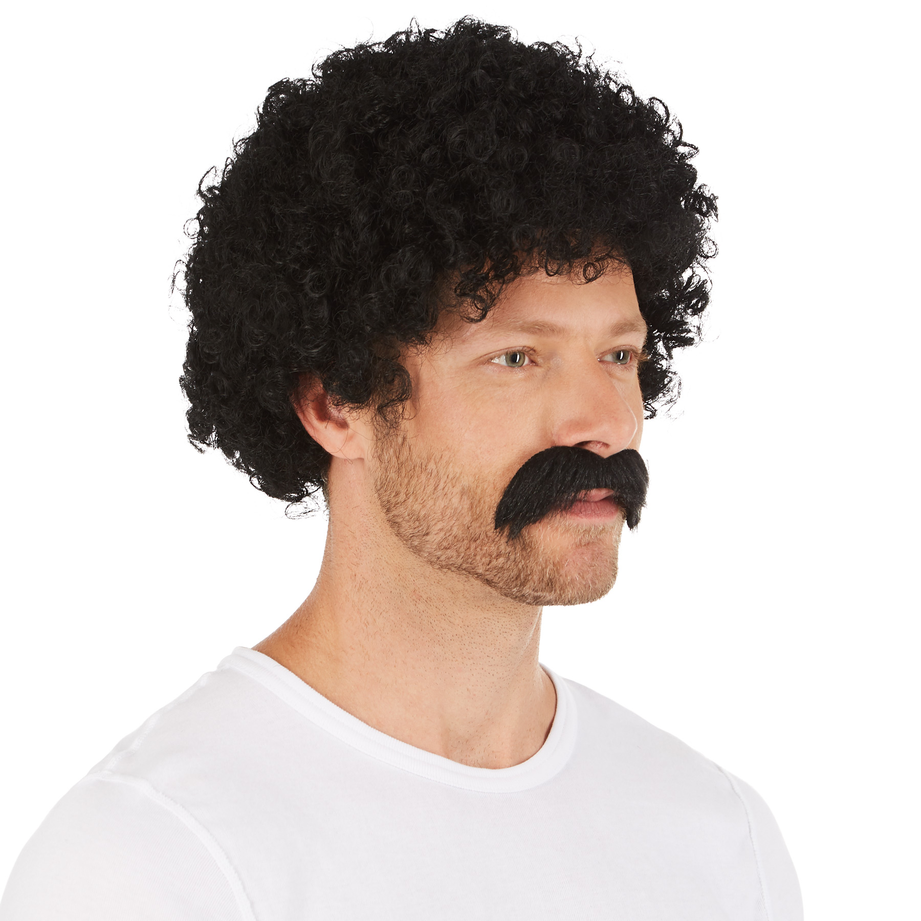 Herrenperücke 80er Disco, Farbe: Schwarz, Haarlänge: ca. 30 cm, dazu wird noch ein selbstklebender Oberlippenbart geliefert, Material: 100 % Polyester.