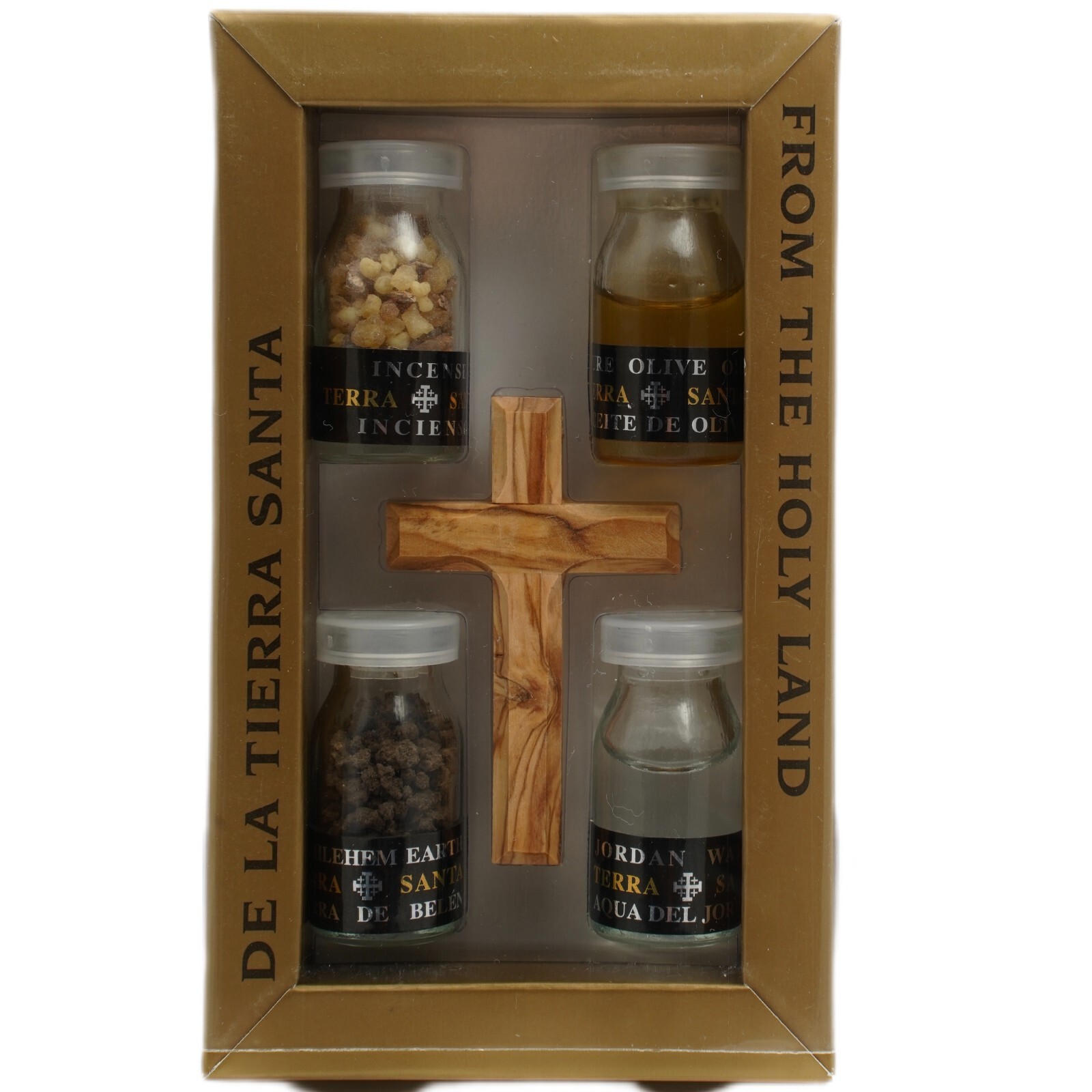 Bring the sacred essence of the Holy Land into your home with our Christian gift set. This meticulously crafted set is designed to enhance your spiritual journey and makes for a thoughtful gift. The set is made out of 5 components: