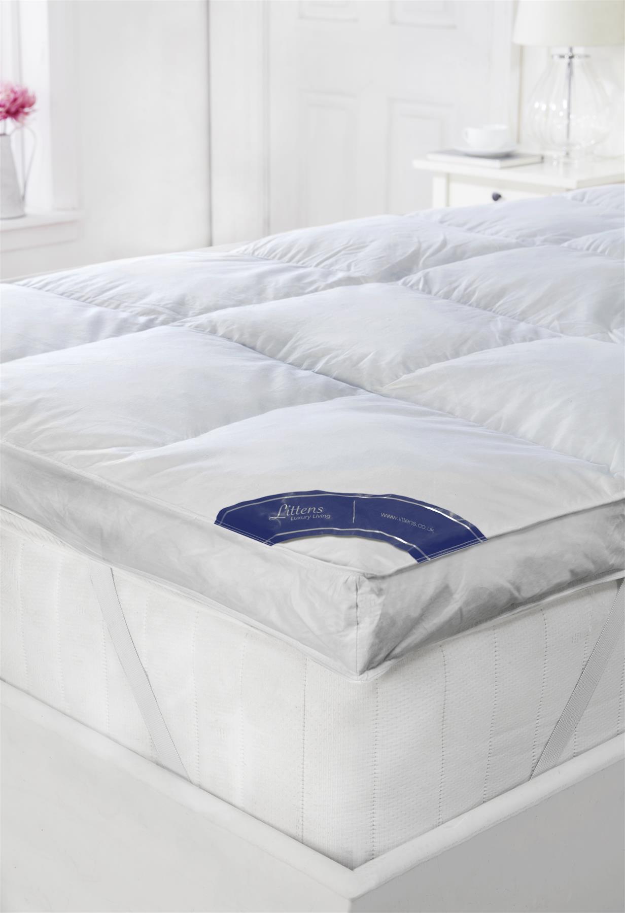 This is a superking bed size luxury white goose feather and down mattress topper. For an ideal level of support, luxury and loft; the mattress toppers are filled with 85% small white goose feather and 15% white goose down. 233 Thread count 100% cotton cambric fabric has been used on these toppers, with a box stitch finish across the topper to help spread and hold the filling for maximum performance. This topper has an inner and outer baffle wall and is complimented with four elasticated anchor bands; one on each corner. This will help hold the topper in place on the mattress.