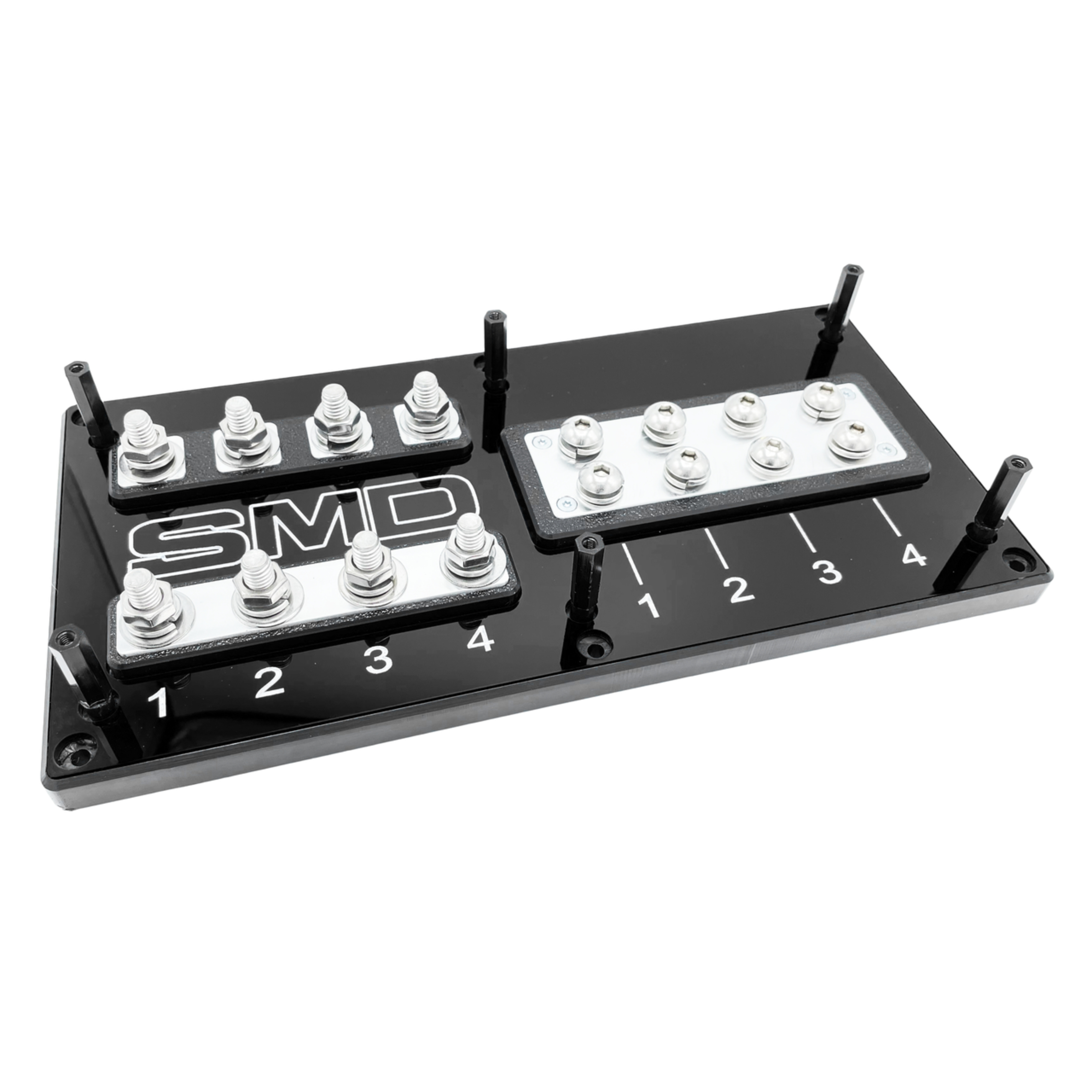 Introducing the SMD PNC-4 (Positive & Negative Combo), the ultimate solution for your power distribution needs. This product seamlessly merges the reliability of the SMD Quad ANL Fuse Block with the functionality of the SMD Half Power/Ground Distribution Block, offering unparalleled convenience and top-notch performance. The SMD Quad ANL Fuse Block ensures safety by preventing potential fire hazards from short circuits, made in the USA with high-quality materials. Its corrosion-resistant design allows flexible mounting under the hood, in the cabin, or even in marine applications. The SMD Half Power/Ground Distribution Block eliminates engine noise and organizes your wiring with a durable 3/4" HDPE body and a 1/4" aluminum or copper bus bar. Available in half block and split block options, this versatile product, made in California, USA, guarantees reliability and long-lasting performance. Simplify your power distribution system, enhance safety, and elevate your vehicle's performance with the SMD PNC-4.
