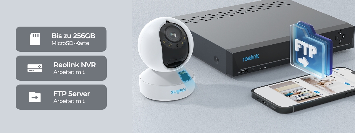 La E1 Outdoor Pro admite grabaciones continuas, por movimiento o programadas 24/7. Puedes guardar todos los videos en una tarjeta microSD, un NVR de Reolink o un servidor FTP. Elige el método que prefieras y disfruta de una seguridad personalizada. Además, no requiere una tarifa mensual.