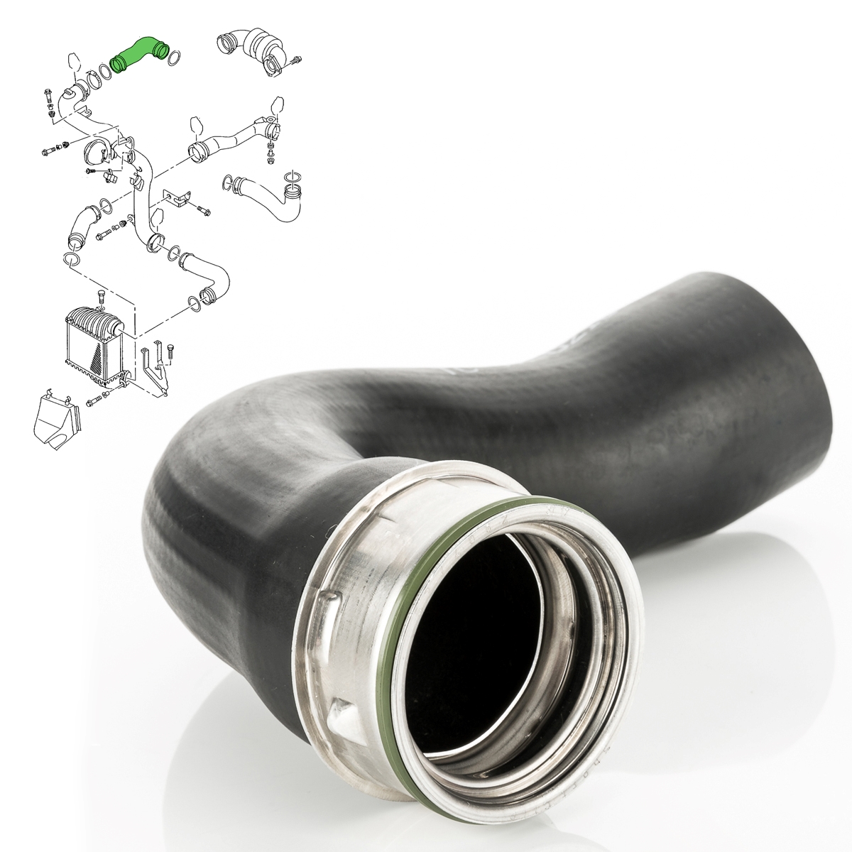 - Einbauposition: vor Turbolader - Material: Gummi mit Gewebeeinlage - Material Kompressionsring/Verdichtungsring: Edelstahl - Innen-Ø an den Enden: ca. 50/55 mm