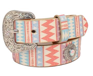 Your little one will look so cute and grownup in this Angel Ranch belt by M&F Western Products. Pastel ivory, pink and turquoise glitter designed strap that is accented with round rhinestone conchos.