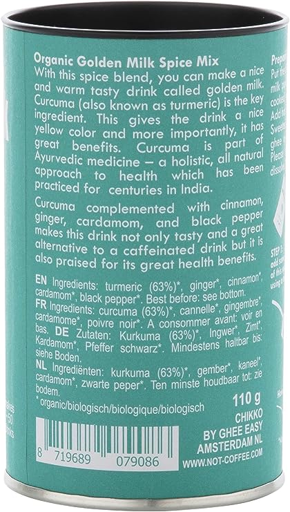 Curcuma Latte with just spices. No sugar, milk powder, additives. By using the spice mix in this attractive packaging, it's simple to make delicious Golden Milk: a warm chai-like beverage, also called Curcuma Latte or Turmeric Latte. This beverage is totally hot & happening nowadays. It stands to reason, because Golden Milk is tasty and healthy! The main ingredient is turmeric. This gives the drink a nice yellow colour and, more importantly, turmeric has fantastic healing properties. Turmeric has been part of Ayurvedic medicine for centuries - a holistic, completely natural approach that originates from India. In addition to turmeric, this pure and organic spice mix also contains cinnamon, ginger, cardamom and - very important - black pepper. No sugar, milk powder or other additives are used. You can choose your own favourite type of milk to make this beverage: cow's milk or vegetable milk. It's also delicious if you add some ghee or coconut oil. Golden Milk is a new product from the Chikko Not Coffee brand. Also try their alternative to coffee using organic roasted chicory.