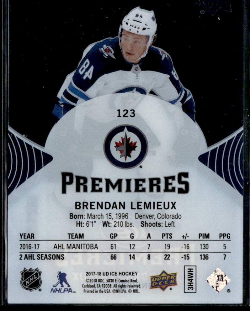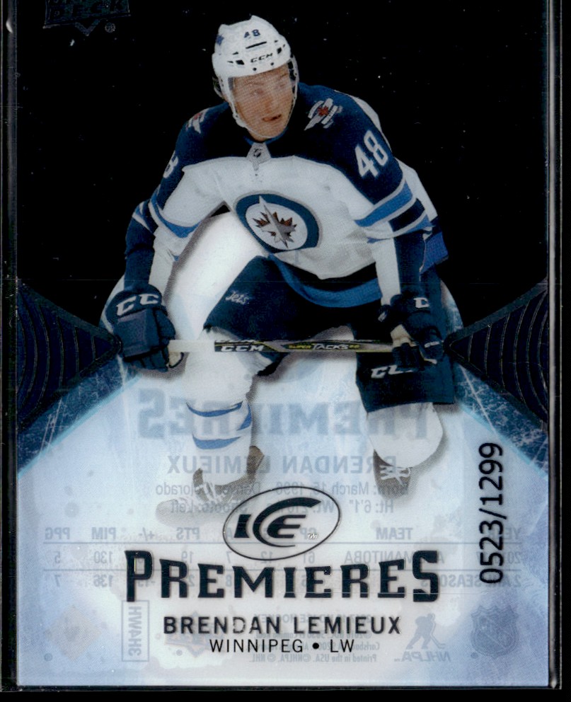 | 2017-18 Upper Deck ICE premeires Brendan Lemieux Rookie 0523/1299 #123 |