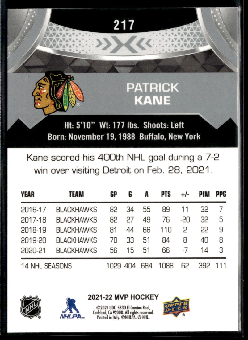| Description: | Patrick Kane | | Category: | Hockey | | Year: | 2021 | | Product: | Upper Deck MVP silver script | | Team: | Chicago Blackhawks | | Card Number: | 217 | | Dimensions: | 3½" x 2½" | | SKU: | HK A0024 R01 G (35) |
