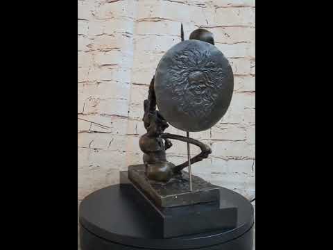 Resting on a sleek black marble base, this modern art sculpture creates a striking contrast against the bronze figure. The harmonious blend of materials elevates its visual appeal, making it an enchanting addition to any art collection or exhibition. The sculpture's meticulous craftsmanship shines through its 100% bronze construction, employing the time-honored lost wax method for enduring quality. Every intricate detail, from the skeletal structure to the intricately designed shield and spear, is expertly brought to life.