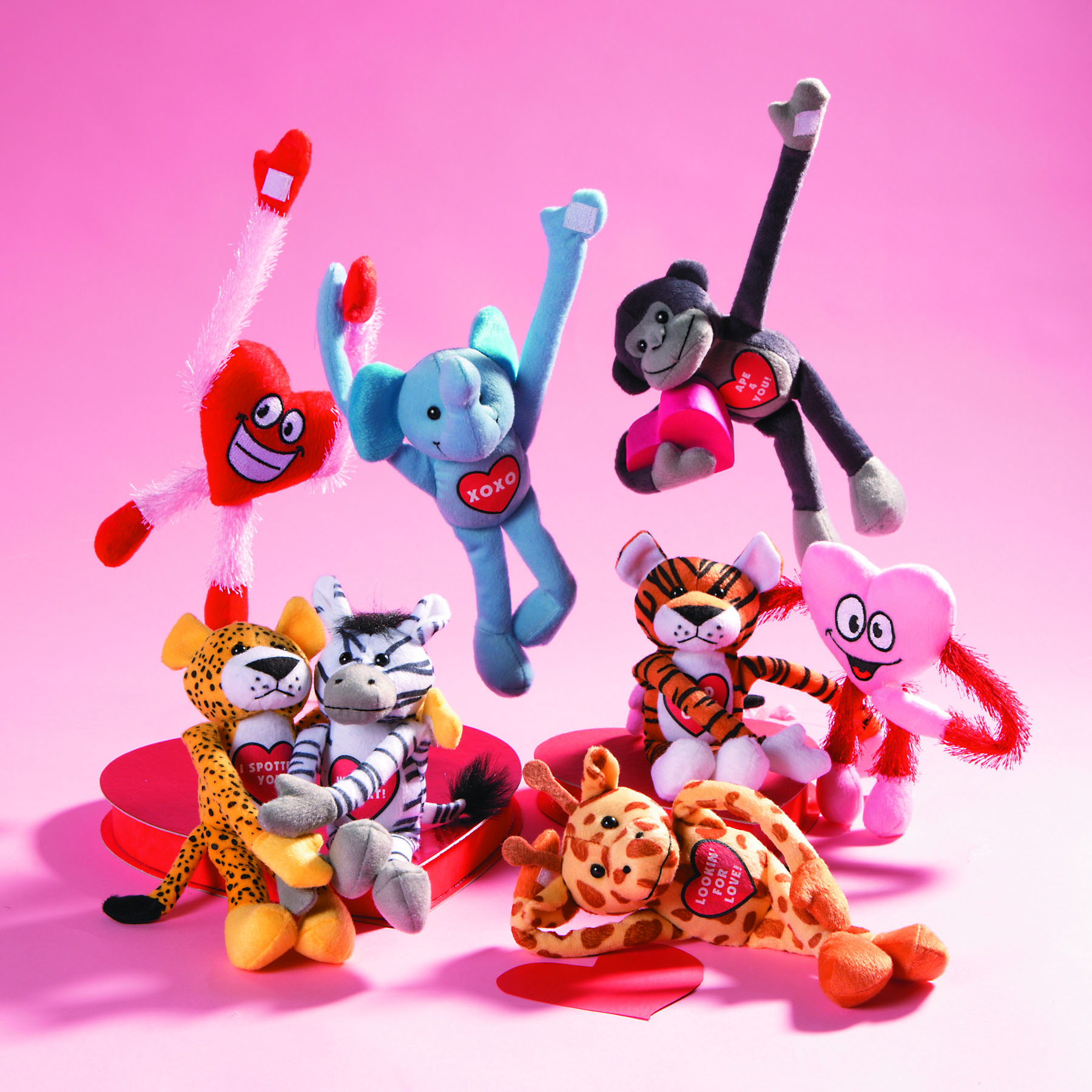 Our adorable Plush Long Arm Valentine Animals love hanging around at the party! Use them as Valentine's Day decorations that are also cute party favors that guests can cherish and enjoy all year long. Send them to your child's Sunday School or classroom Valentine's Day party as sweet alternatives to sugary Valentine's candy that youngsters will enjoy long after the treats are eaten! Includes touch fastener hands. Hanging 11"; arm span, 13 1/2". Assorted.