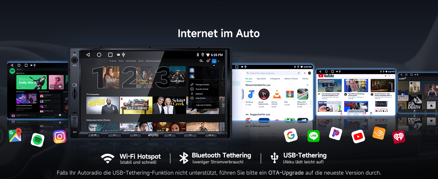 Internet-Konnektivitätsoptionen: Wählen Sie Ihre bevorzugte Methode – WLAN-Hotspot, Bluetooth-Tethering oder USB-Tethering – für den Internetzugang. Erleben Sie ein intelligentes Fahrerlebnis mit nahtloser Internetverbindung für OTA-Updates (Over-the-Air)