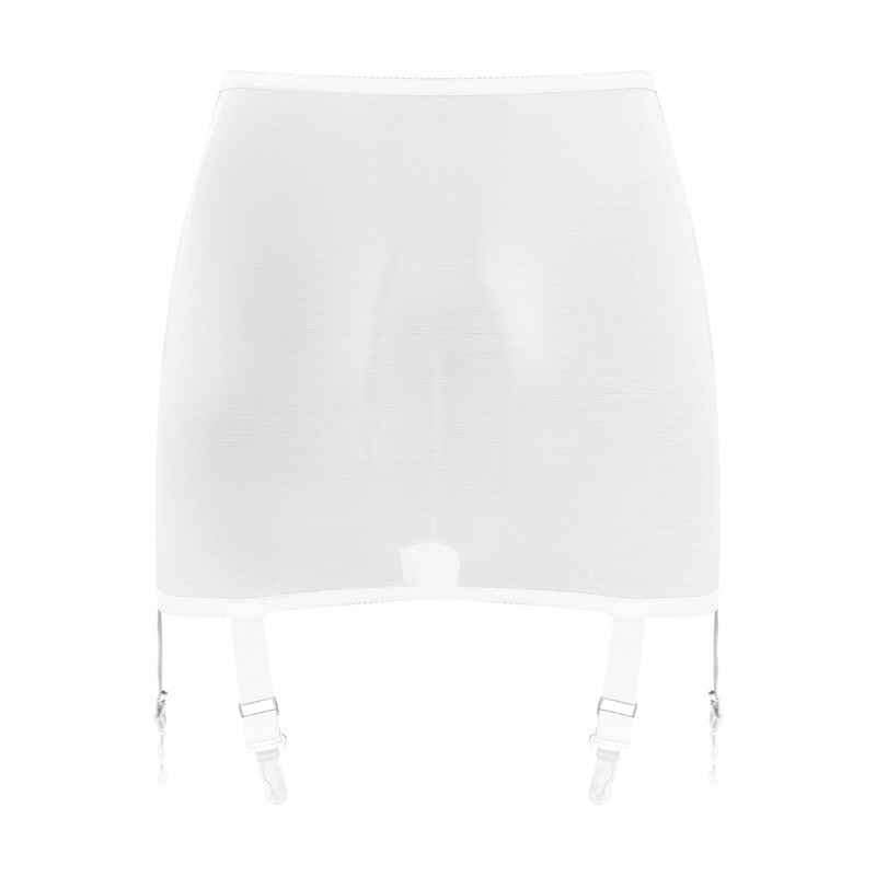 Sheer mesh skirt is designed with see-through mesh, elastic bands, 6 adjustable garter belts with clips, solid color and mini length.