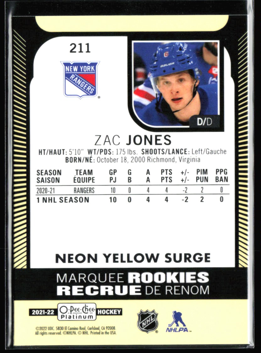 | 2021-22 O-Pee-Chee Platinum RC neon yellow surge Zac Jones Rookie #211 |