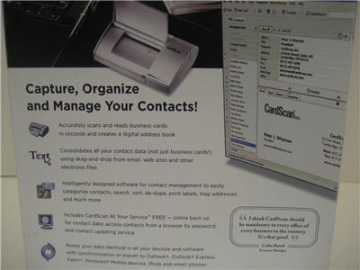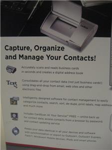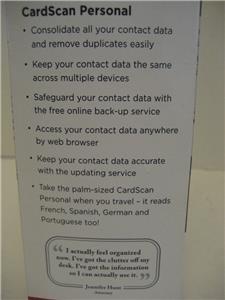 Personal Business Card Scanner scans a card in less than 5 seconds or drag and drop from e-mail signatures, web pages and more. CardScan software automatically enters the data in the appropriate fields to create an indispensable digital address book. This palm-size black and white scanner comes with a travel pouch so you can scan anywhere. New capabilities let you save contacts in .csv (spreadsheet) and .vcf (vCard). Improved interface makes editing, searching, sorting, categorizing and de-duplicating contacts faster and easier than ever. Sync CardScan data seamlessly with Outlook, Outlook Express, Palm, Windows, Mobile and Windows Contacts and/or print DYMO mailing labels directly with your LabelWriter 400 or 450 series label printer (sold separately).