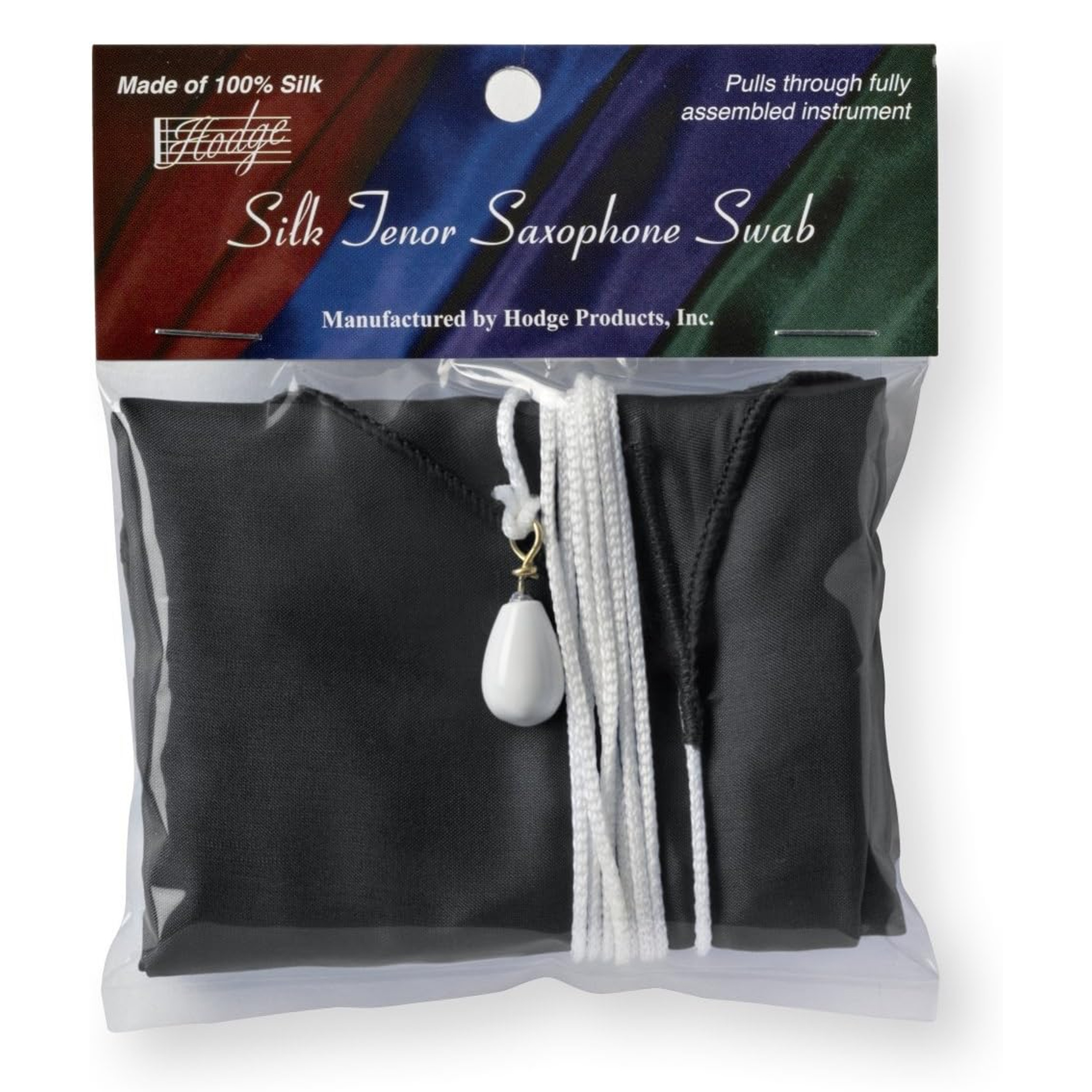 All Hodge silk swabs are made from 100% silk and come in performer's black, royal blue, burgundy, forest green, and deep purple. Silk is very absorbent, soaking up water in instruments better than any other natural material on the market, including both cotton and chamois. Most uniquely, silk is also very compressible, making it possible to pull through instruments with large variations in bore size. In addition, silk is lint free.