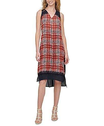 Make a statement in head-turning prints. From the V-neck to the high-low hemline, this romantic lace trimmed sleeveless Dkny dress radiates a fall-ready aesthetic.