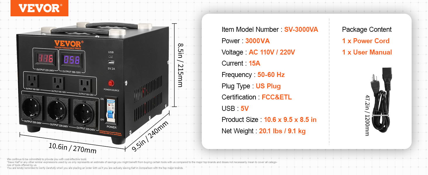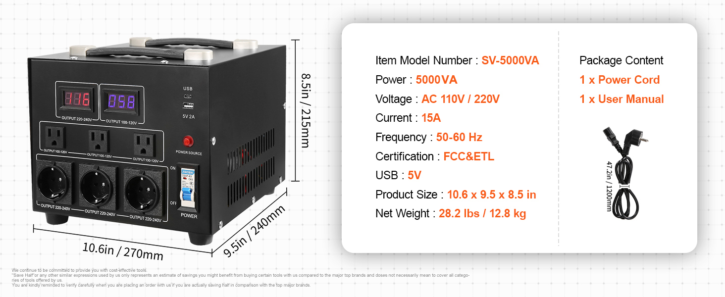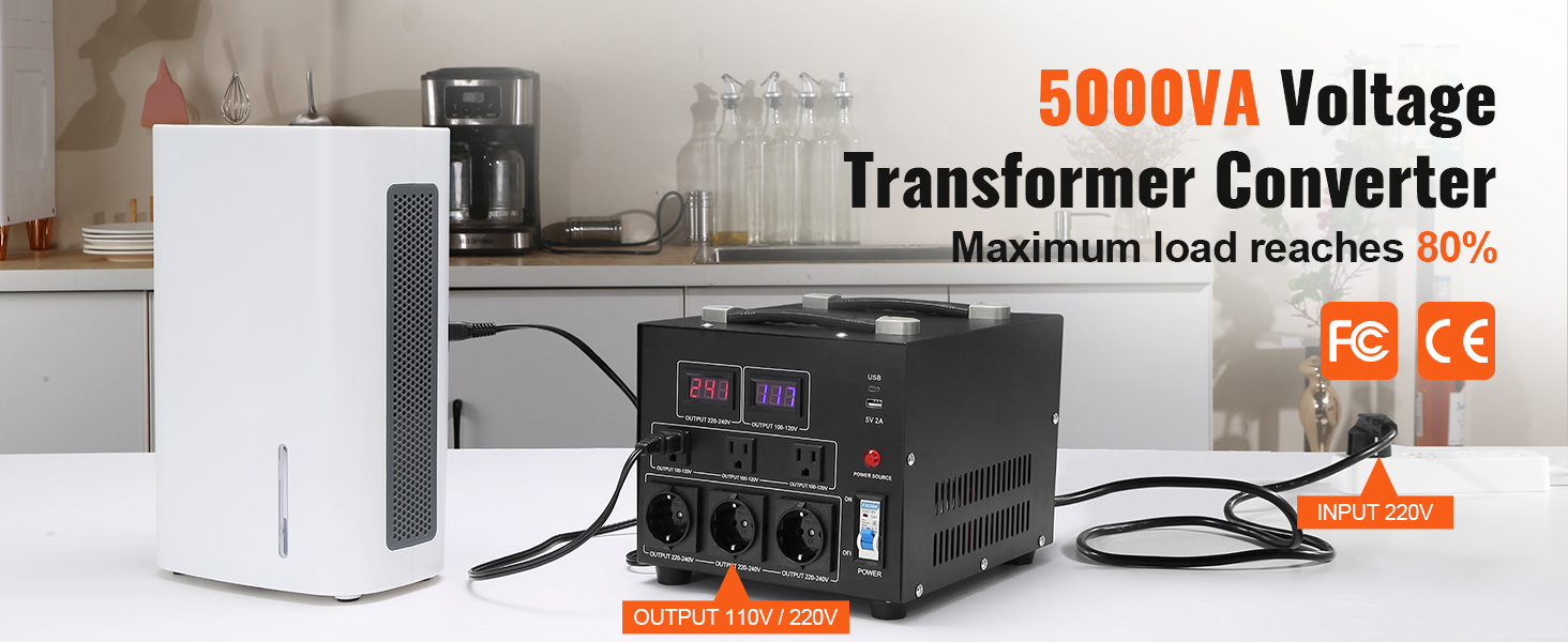3000W/5000W/2000W/1000W/500W Voltage Converter Transformer: This step up down transformer features 6 AC plugs, including 3 US/2 US NEMA 5-15R 3-Pin output sockets, 3 European Shucko output sockets, 1 5V USB port, and 1 Type-C jack. It is built with 2 LED displays showing the current output voltage in real-time to avoid transformer overload.