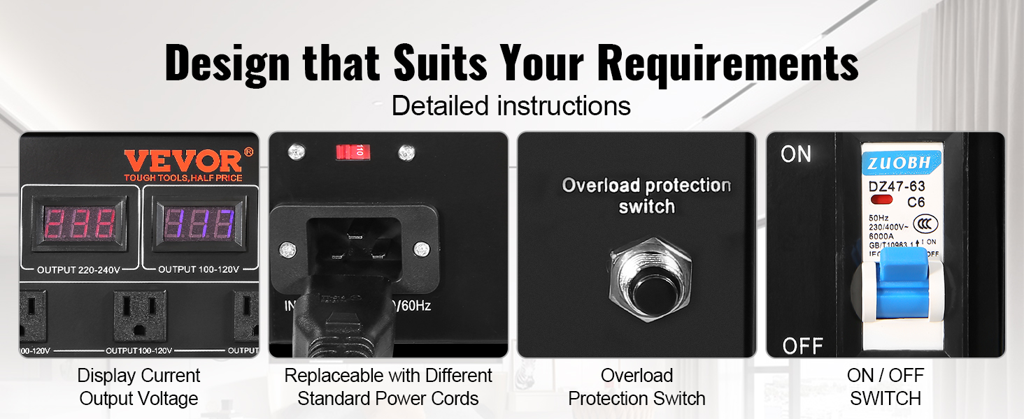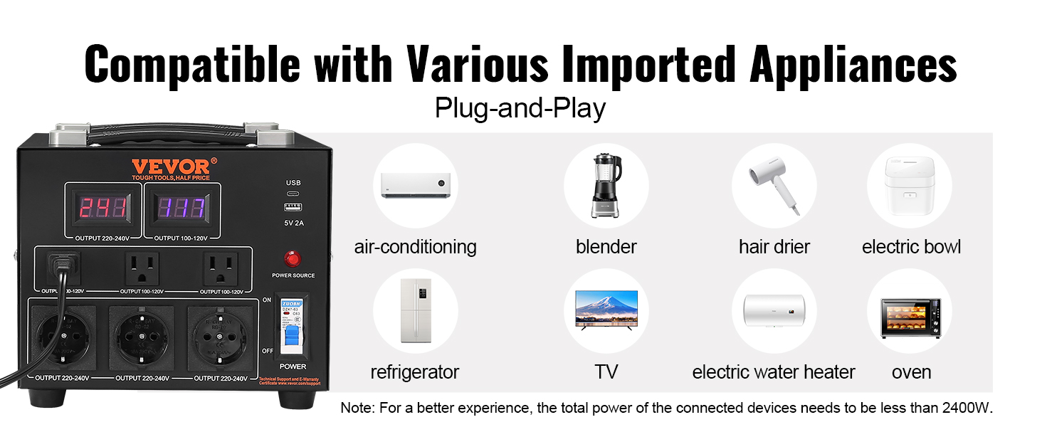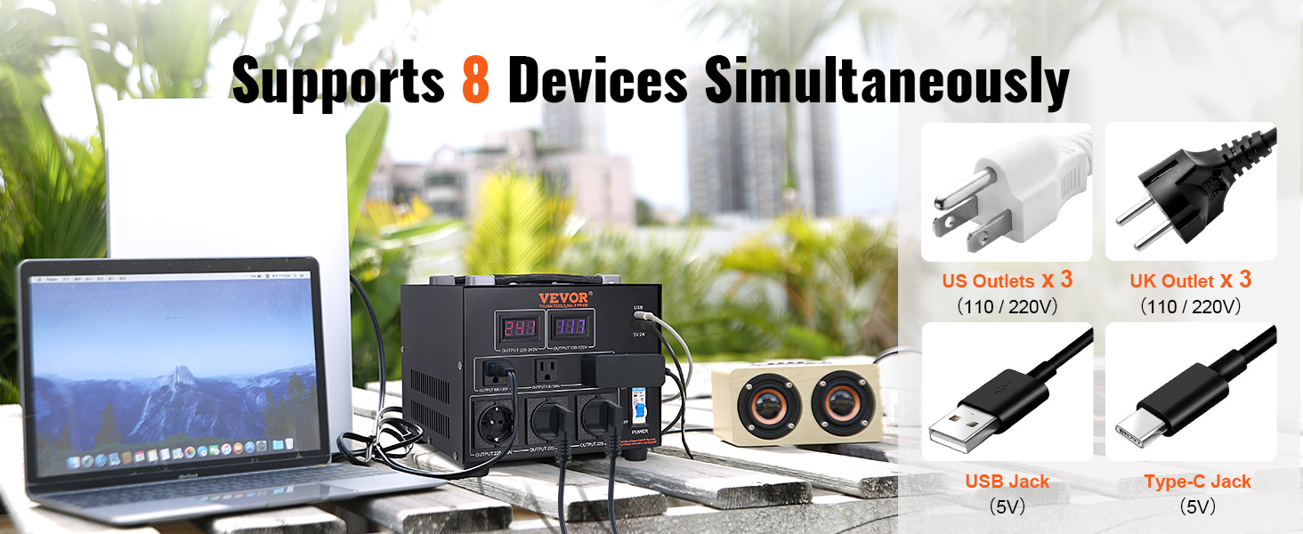 This new VEVOR voltage converter transformer achieves 110V/220V bi-directional voltage conversion, applicable to most countries' voltage interchange, so you can bring domestic appliances and use them abroad. It has 8 outlets, supporting up to 8 devices connected to use simultaneously.