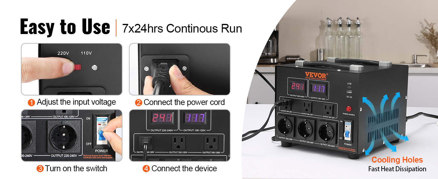 Advanced Step-Up/Down Technology: By adjusting the input voltage switch, you can step up the input voltage from 110 volts to 220 volts or step down from 220 volts to 110 volts. Please switch to the correct voltage before powering on. Universal power wiring slot allows you to purchase a separate power cord to connect and use according to the jack in different countries.