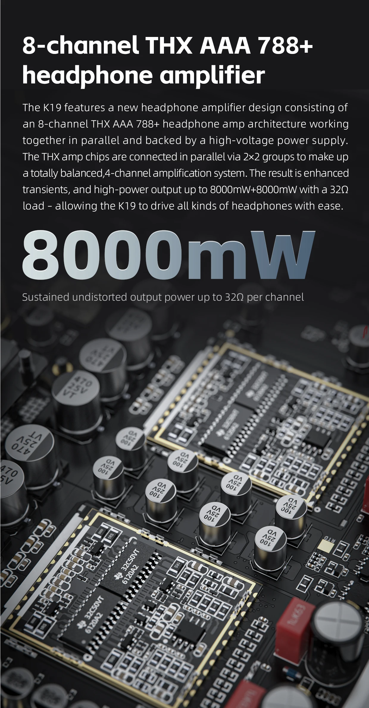 At the heart of FiiO K19, we have a high-power 8-channel THX AAA 88+ Amp chipset. The THX amp chips are connected in parallel with each other, creating a fully balanced 4-channel design architecture for the headphones. It is a powerful analog amp section that promises a strong output of up to 8W per channel. With this much power down its sleeve, You can easily drive even the most demanding headphones on the planet and still have a lot of headroom left.