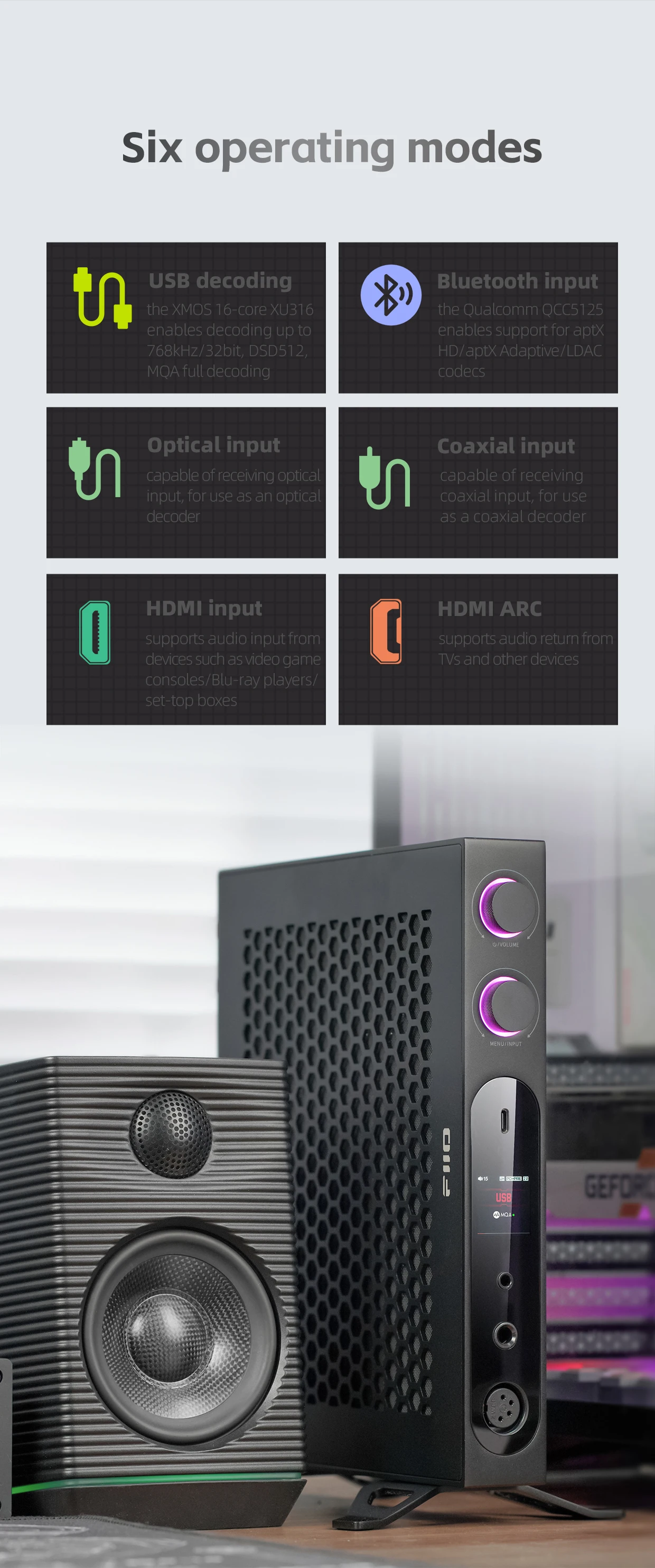 FiiO K19 supports a bunch of input options for the sound signal. From traditional USB to wireless Bluetooth, and now we also have support for HDMI and ARC capabilities. The K19 is the first DAC/AMP in FiiO;’s lineup to support HDMI and ARC input options. The HDMI input supports 192kHz/24-bit sampling rate audio and the HDMI ARC supports 44.1/48kHz bitrates. Other options include USB, Optical, Coaxial, and Bluetooth connections.