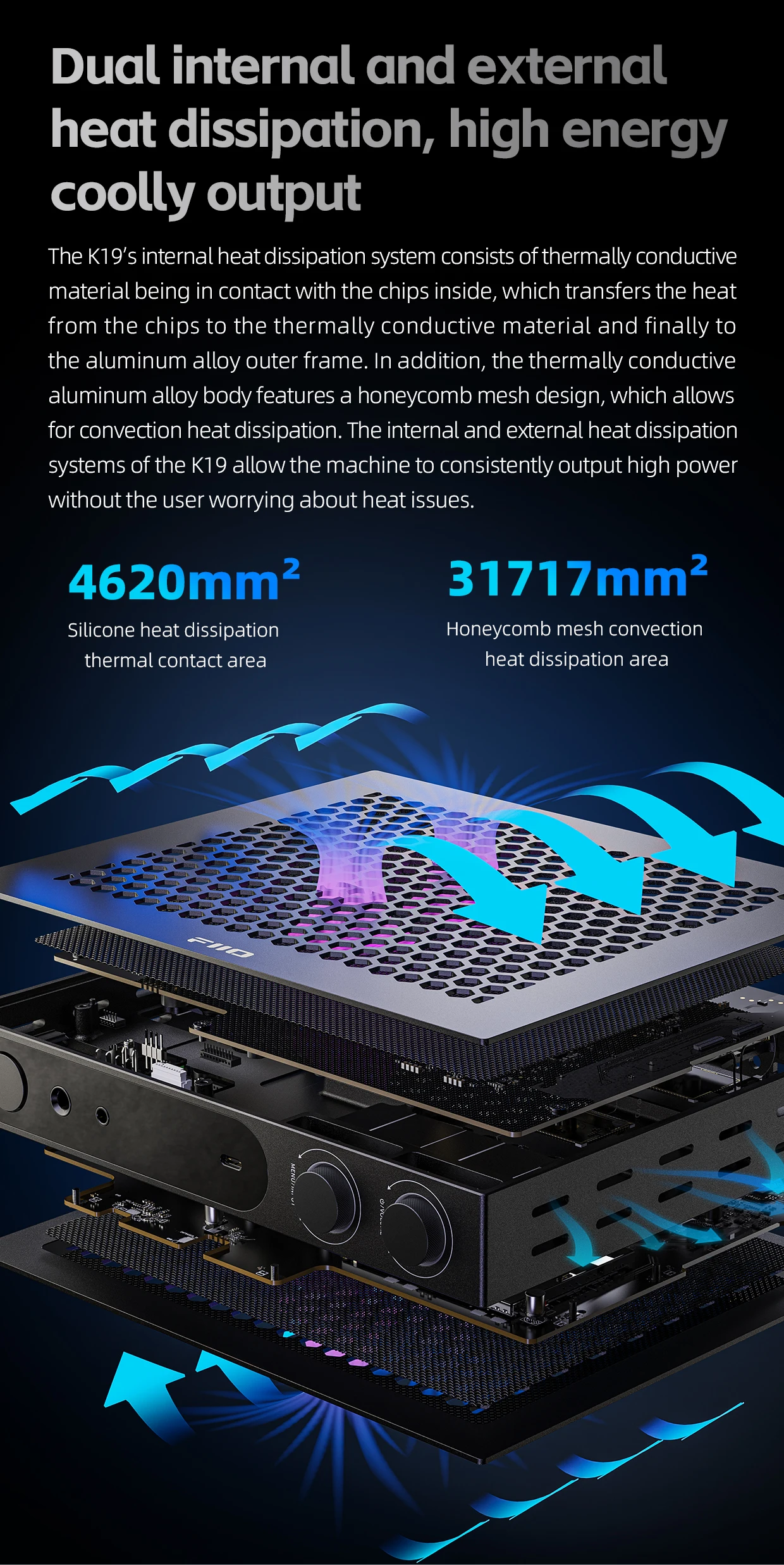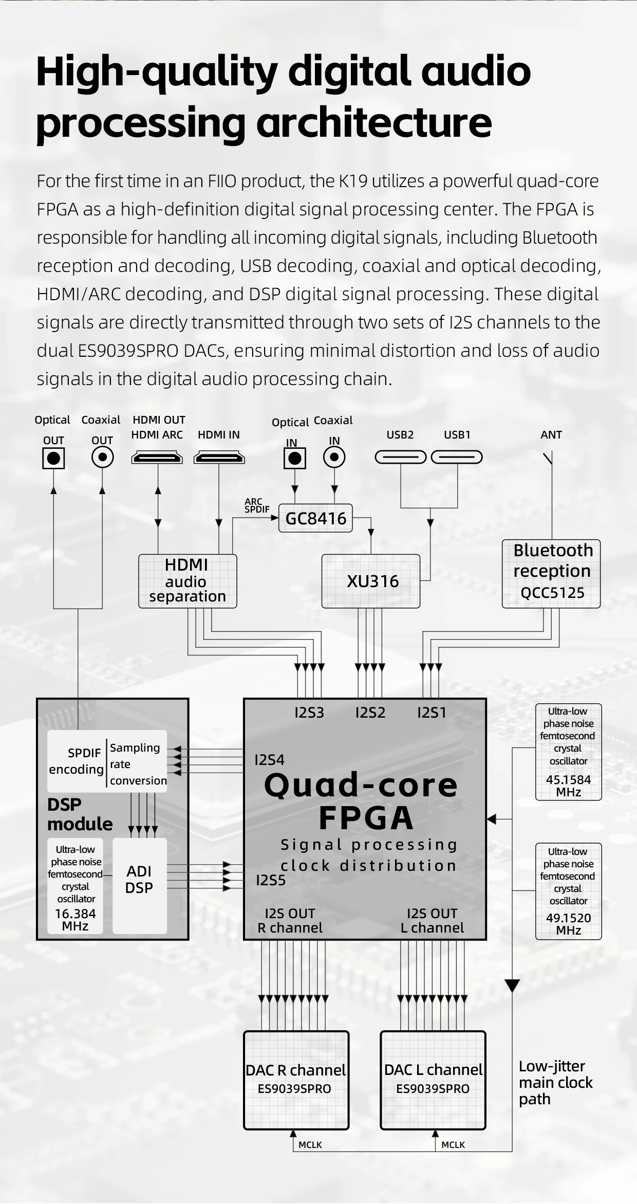 FiiO K19 houses dual industry-leading ACCUSILICON AS318-B ultra-low phase noise Accusilicon Femtosecond crystal oscillators. They are pre-screened before being selected for the K19. They ensure pure sound signal restoration during processing and result in clearer, more accurate sound signal reproduction at different sampling rates.