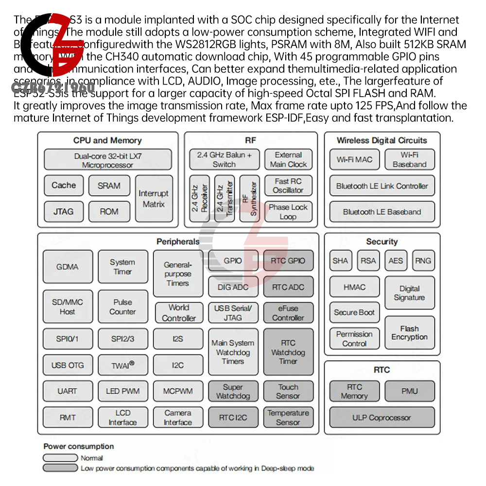 Features1.ESP32-S3 is a module implanted with a S0C chip specially made for IoT, the module still adopts a low power consumption solution.