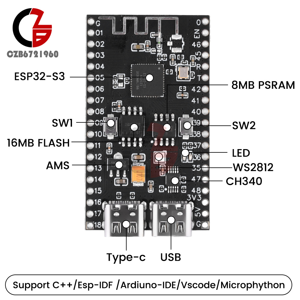 2. Integrated WIFI and Bluetooth functions, configured with WS2812 RGB light, external 8M PSRAM, also built-in 512KB SRAM memory.