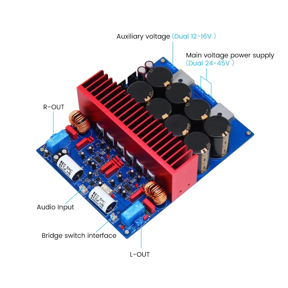 The newly designed IRS2092 digital power amplifier board is designed according to high standard fever level, with all components carefully selected and high standard, completely designed according to high fidelity level. The rectifier circuit is completed using two 50A high current bridge stacks and 80000UF original capacitors, with sufficient energy