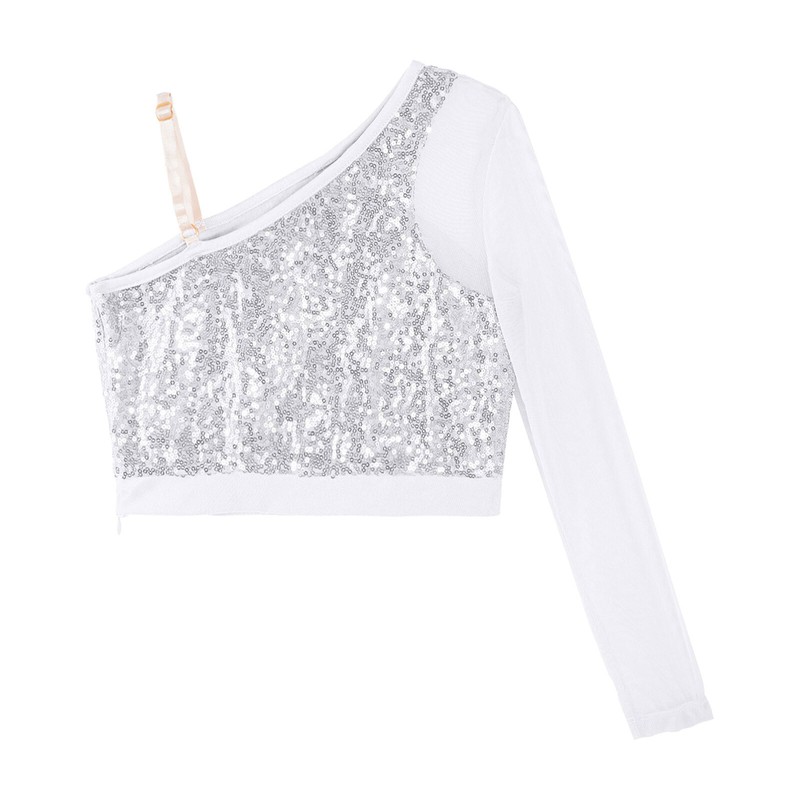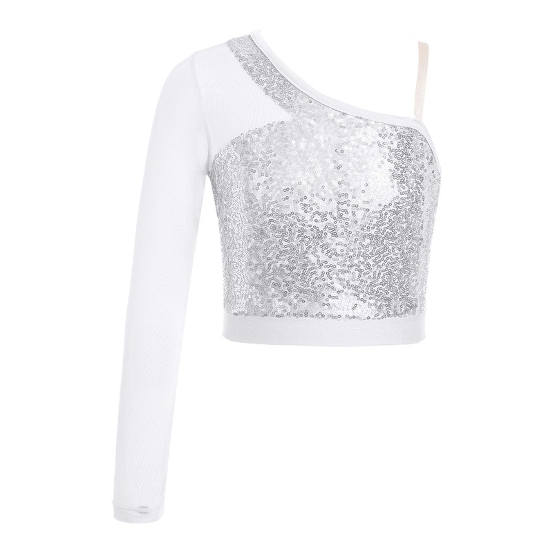 Kids Girls Sequins Ballet Dance One Shoulder Mesh Long Sleeve Crop Top Dancewear
