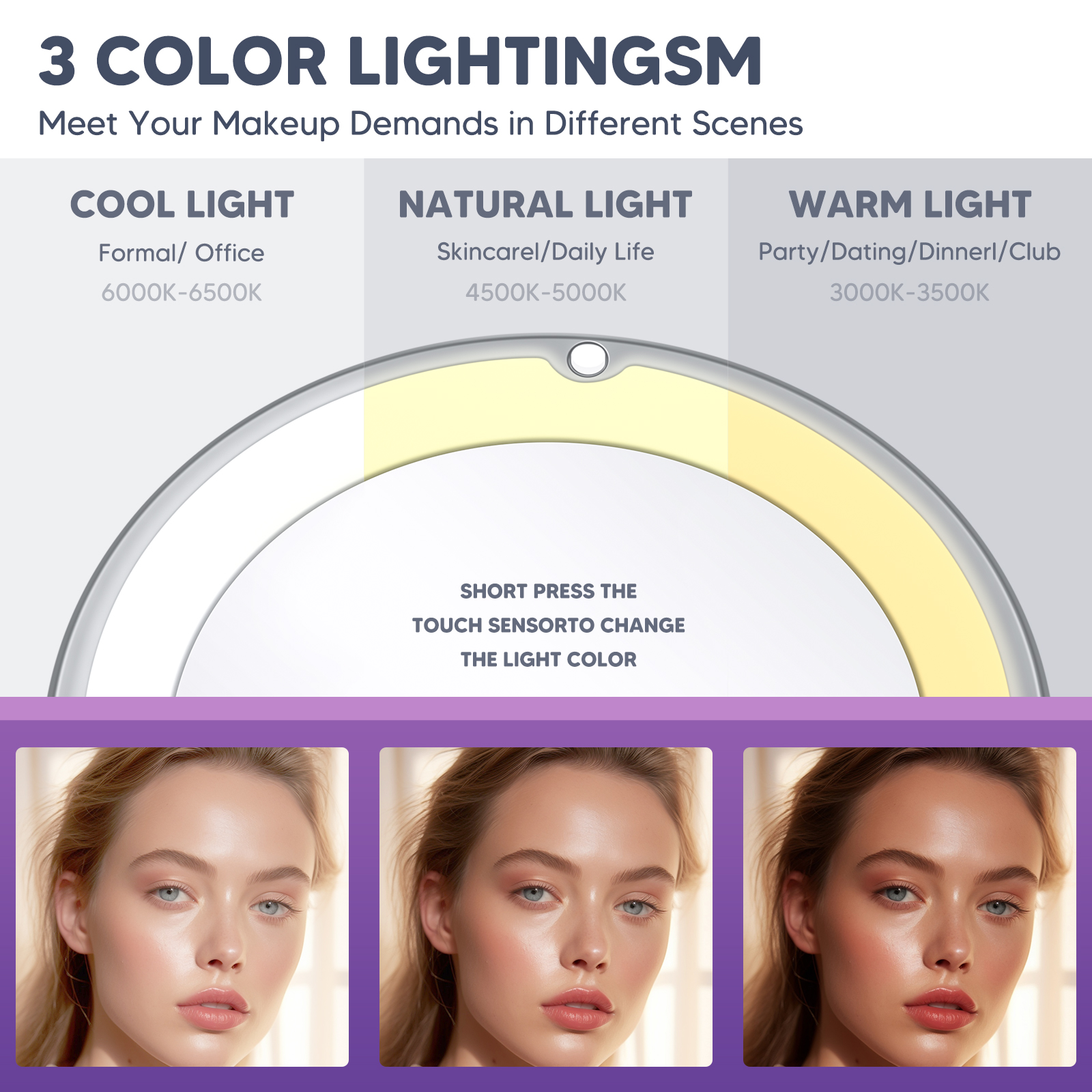 - 𝟑 𝐂𝐎𝐋𝐎𝐑 𝐋𝐈𝐆𝐇𝐓𝐈𝐍𝐆 & 𝐀𝐃𝐉𝐔𝐒𝐓𝐀𝐁𝐋𝐄 𝐁𝐑𝐈𝐆𝐇𝐓𝐍𝐄𝐒𝐒 - With three color lighting options (daylight, warm light, and natural light) and adjustable brightness settings, this mirror offers customizable illumination for any environment or time of day, enhancing the user's experience. Powered by 3 AAA batteries, not included.
