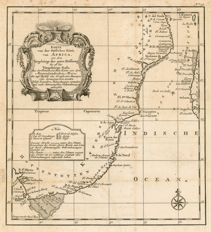 Oben links der Titel. - Zeigt auch die Küste von Mosambik, sowie einen Teil von Madagaskar. Im Süden das Kap der guten Hoffnung.