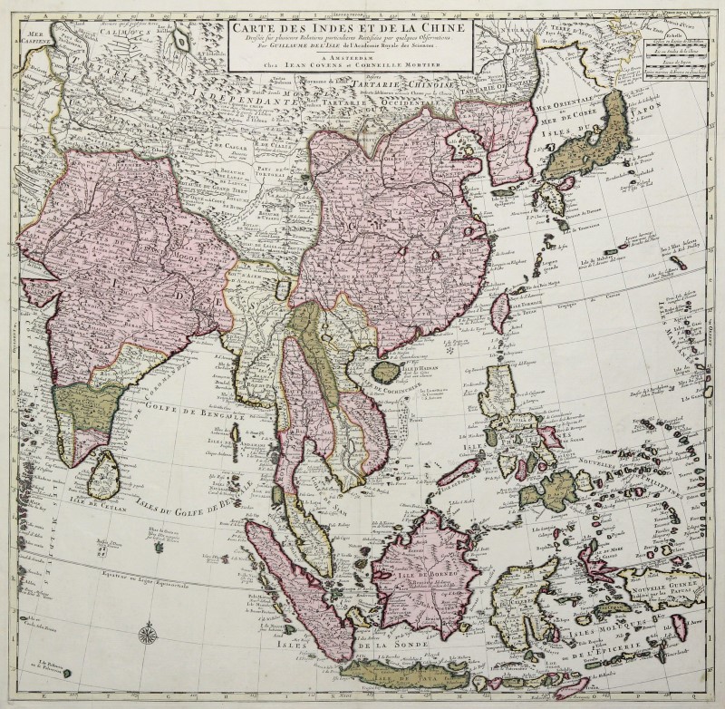 Koemann C. & M 9 (Nr. 43 ); Quirino 89. - Oben mittig Titelkartusche. Zeigt ganz Südostasien mit Indien im Westen, Japan im Nordosten (Hokkaido als Halbinsel) und Indonesien im Süden. Das dekorative Kolorit etwas verblaßt, mit kleinem Löchlein in der alten Faltung.