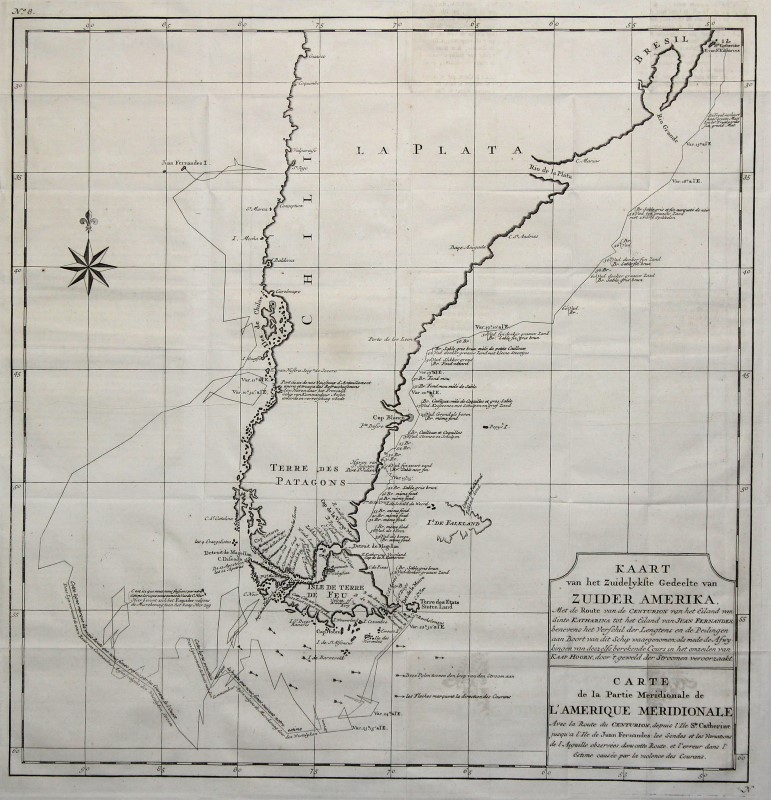 Chile - Argentina: Kst.- Card, de '.. Tour du Monde 'de Anshern,' Kaart Van Het Zuidelykste Van Zuider America .. - Carte de la Partie Meridional Avec la Route du Centurion Depuis L'Ile Ste. Catherine Jusqu'a l'Ile de Juan Fernandes Les Sons es Variación de L'Aiguille Observées dans Cette Route et lèrreur dans l'Estime causee par la violence des curans ',