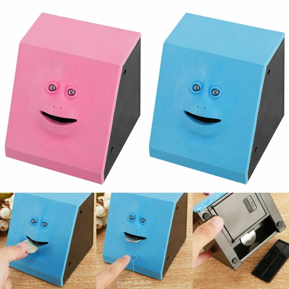 Put your coin on its mouth, and the face bank will "eat" it to its tummy.