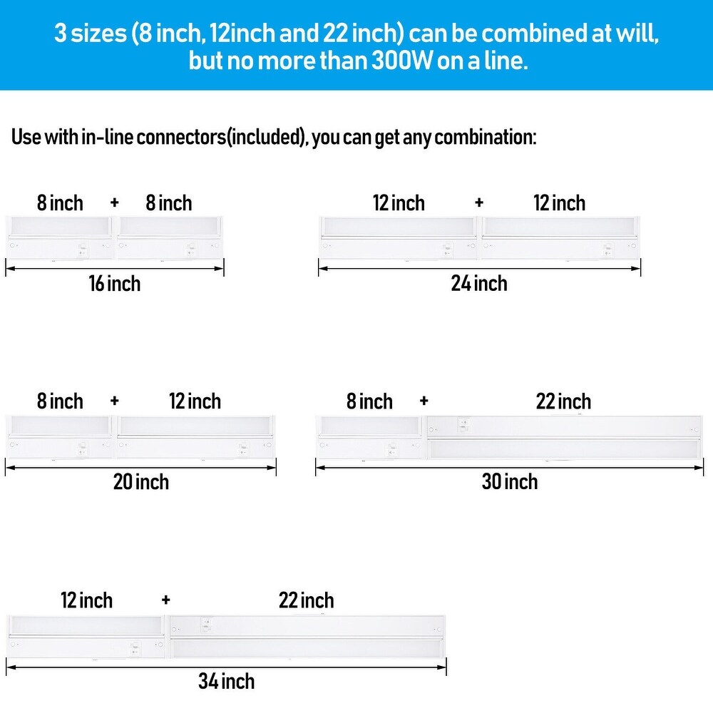 This LED closet lighting provides two convenient ways to connect your lights. With the included accessories, you can achieve seamless connections for straight, long cabinet lighting. Alternatively, you can use jump cables to connect multiple lights, making it easy to light the corners of your cabinets without additional plugs. Each light bar comes equipped with one in-line connector and one jump cable, and additional, longer jump cables can be purchased separately. Enjoy effortless installation and customization with these versatile connection options.