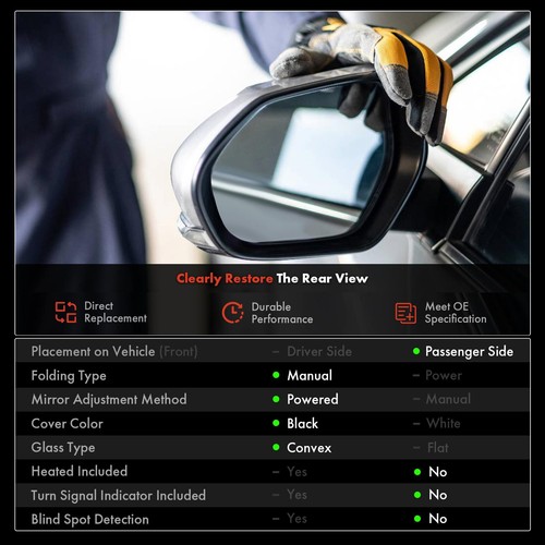 IMPORTANT: Please confirm photos of this side mirror and the above specifications to match those of your existing factory mirror before making a purchase.