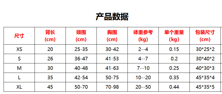 Size,Back Length,Neck Circumference,Bust,Suitable Weight