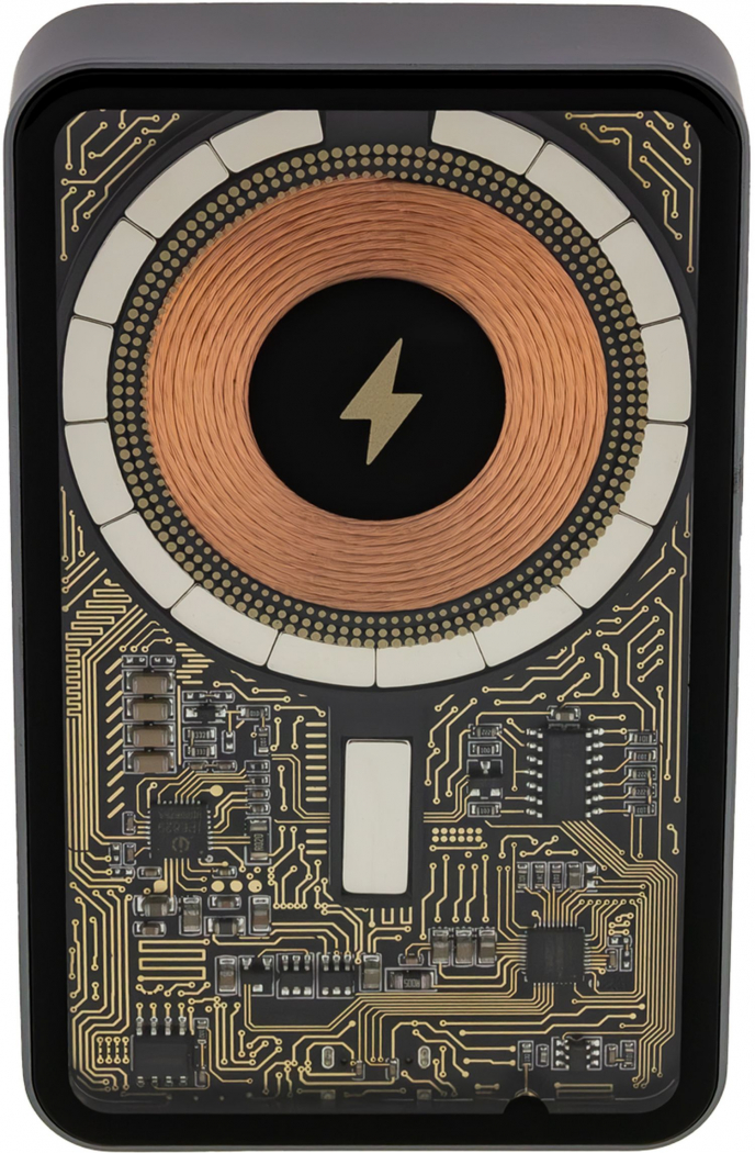 Die Powerbank lädt mit PD20W-Standard und besticht mit ihrem futuristischem Metall-Gehäuse. Dieses ist an der Vorderseite transparent und gibt den Blick auf den goldene PCBA (Printed Circuit Board Assembly) frei. Es verbindet somit modernes Design mit Leistungsstärke.