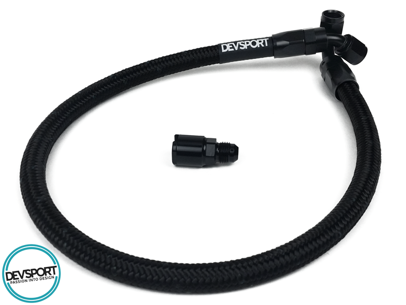 This kit replaces the OEM rubber feed line with a stylish -6an black nylon braided line. We provide a special EFI fitting that attaches to the hard line on the firewall just like the oem connection, no modifications needed. The new feed line routes from the firewall, along the transmission and up to the fuel rail. Giving your engine bay a nice, clean, "tucked" look.