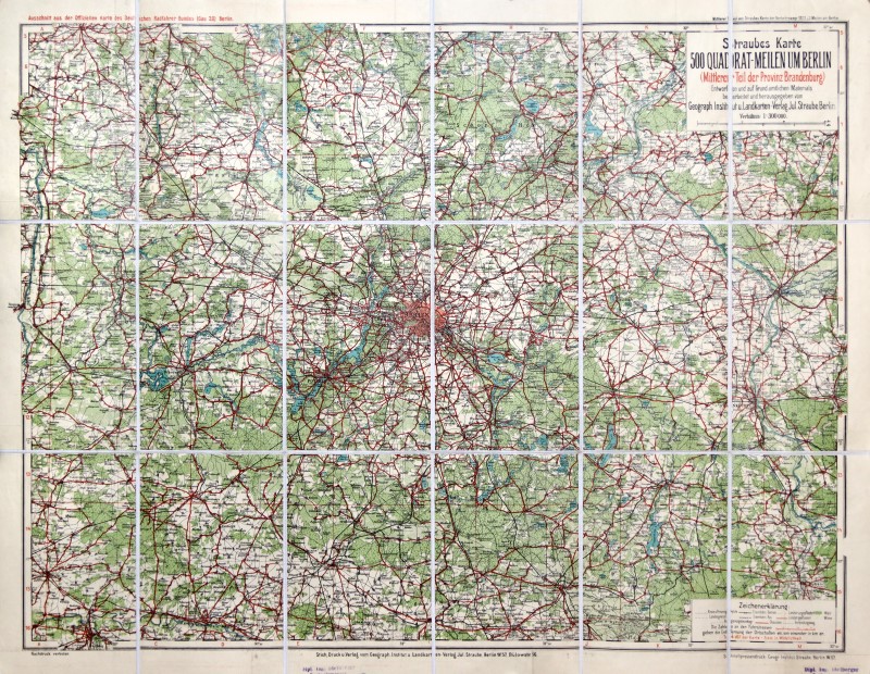 Detailriche Umgebungskarte mit Berlin im Zentrum, reicht von Tangermünde im Westen bis Drossen (Osno Lubuskie) im Osten, von Templin im Norden bis Luckau im Süden. Wie üblich zerschnitten und auf Leinwand montiert, faltbar eingerichtet. Mit alten Sammlerstempel.