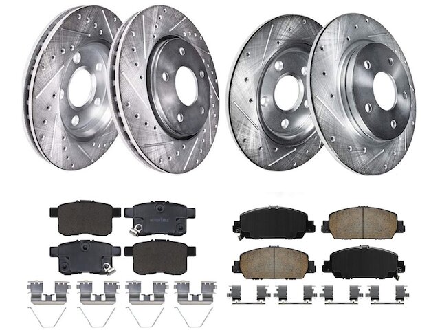 - Kit Includes: (2) Front Drilled and Slotted Brake Rotor + (2) Rear Drilled and Slotted Brake Rotor + (2) Front Ceramic Brake Pad + (2) Rear Ceramic Brake Pad