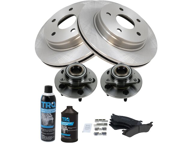 Package Contents: (2) Front Wheel Bearing & Hub Assemblies; (2) Front Brake Rotors; (1) 12 oz DOT 3 & 4 Brake Fluid; (1) 13 oz Non-Chlorinated 50 State Formula Brake Cleaner; (1) Front Semi-Metallic Brake Pad Set with Contact Point Grease & Hardware