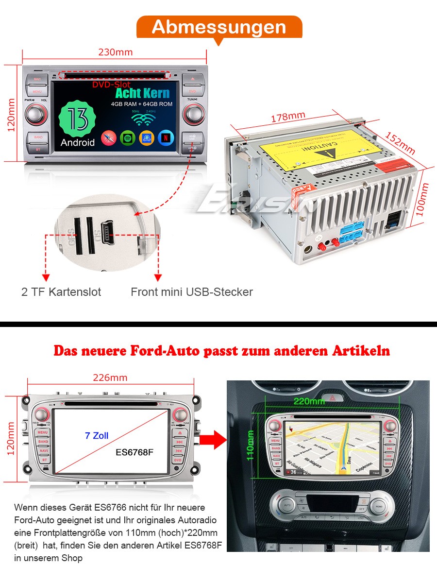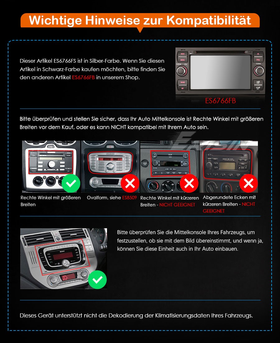 3. Falls der Artikel nicht zu Ihrem Auto passen kann und Sie brauchen ein Gerät mit Panel-Abmessungen von 220mm(Breit)*110mm(Hoch), bitte schauen Sie unsere andere Model ES6768F im Laden.