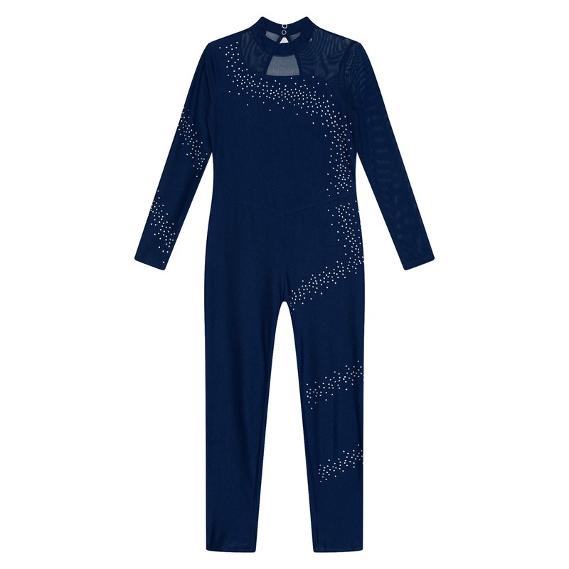 This figure skating jumpsuit with sheer mesh patchwork design and rhinestones makes your child stand out from the crowd.