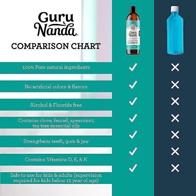 TRADITIONAL BENEFITS OF GURUNANDA OIL: This GuruNanda Pulling Oil helps maintain oral hygiene. Spearmint, Peppermint, Cardamom & Fennel essential oil helps with bad breath. Clove, Oregano & Tea Tree essential oils supports gum health. Fractionated coconut cleanses your mouth. Vitamins D, E, K2 support oral & bone health of the mouth. This pre-rinse mouthwash helps freshen breath, maintain healthy gums, strengthens & whitens teeth.
