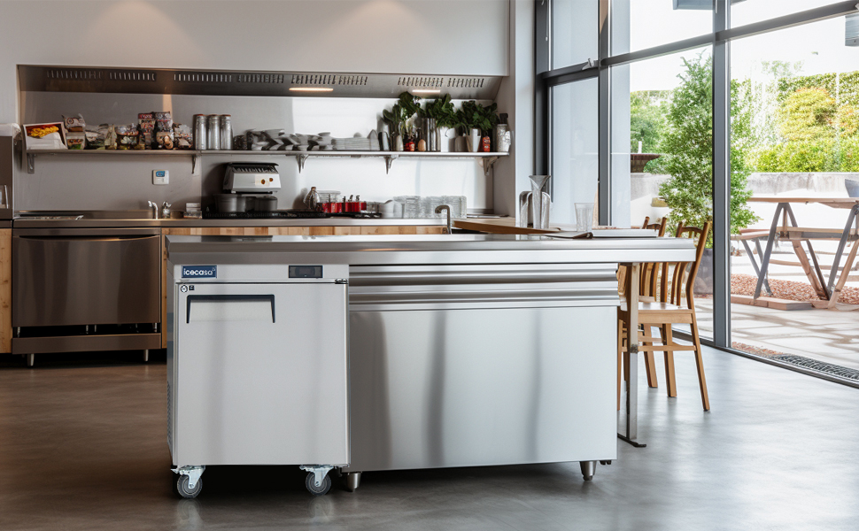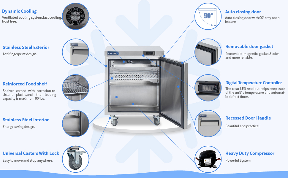 ICECASA 27" W Commercial Freezer Worktop Undercounter Freezer Single Door Stainless Steel Counter Fan Cooling Freezer 7 Cu.ft for Restaurant, Bar, Shop, etc.
