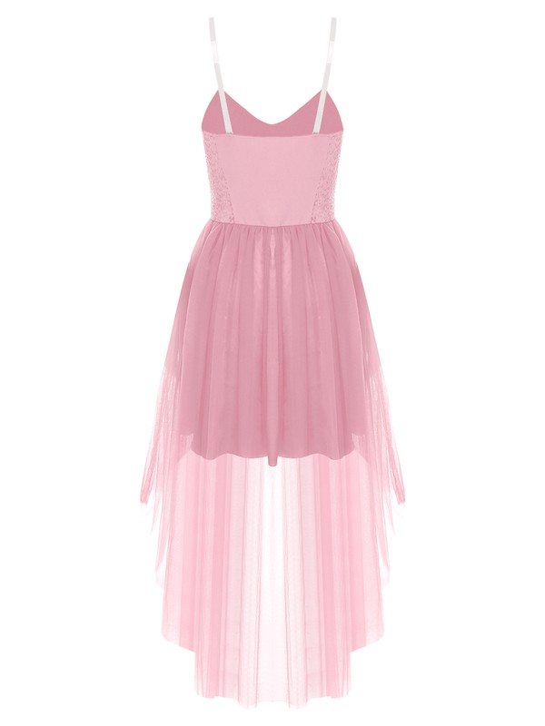 Designed with v neck, sleeveless, detachable transparent shoulder straps, sequined bodice and high-low tulle hem, pullover style.