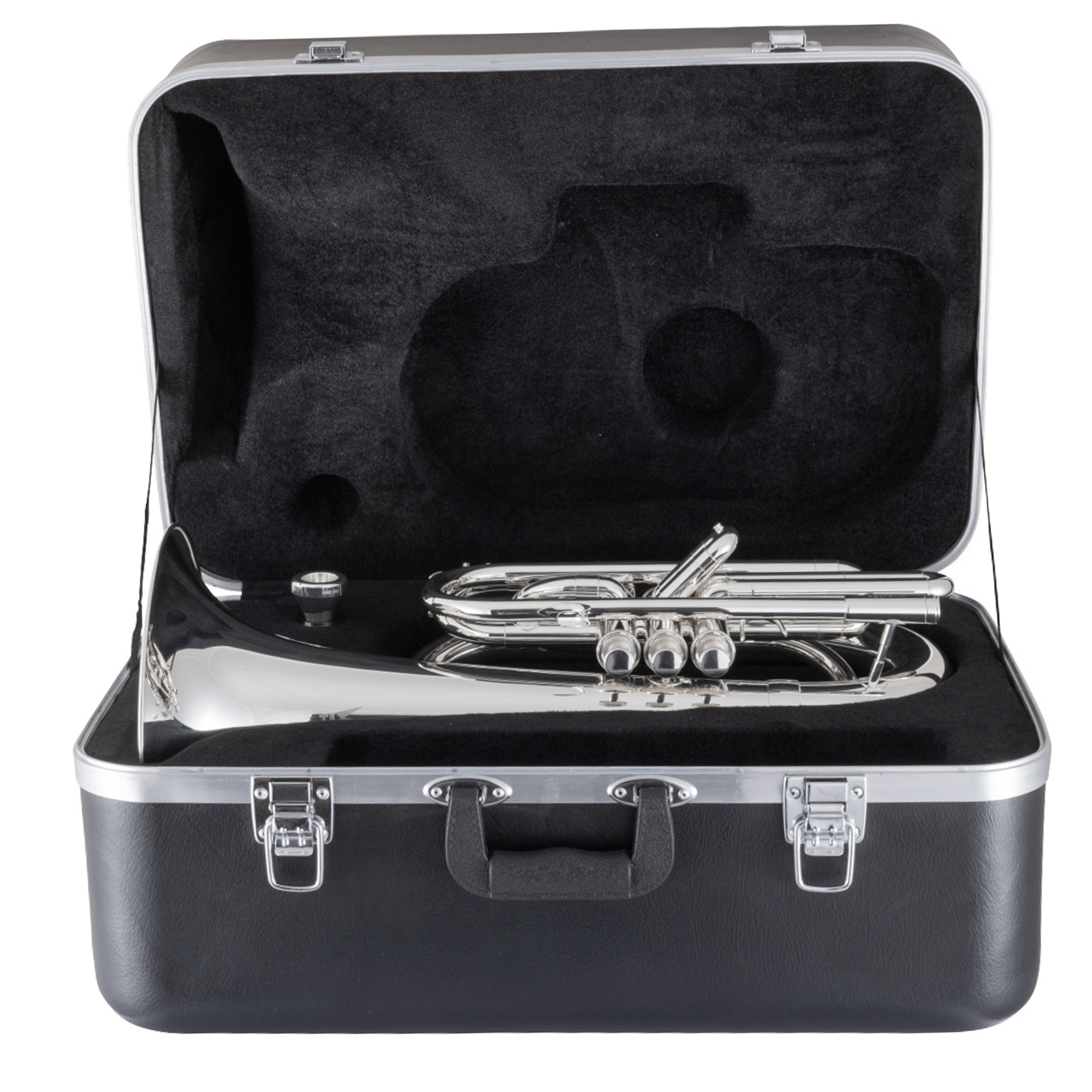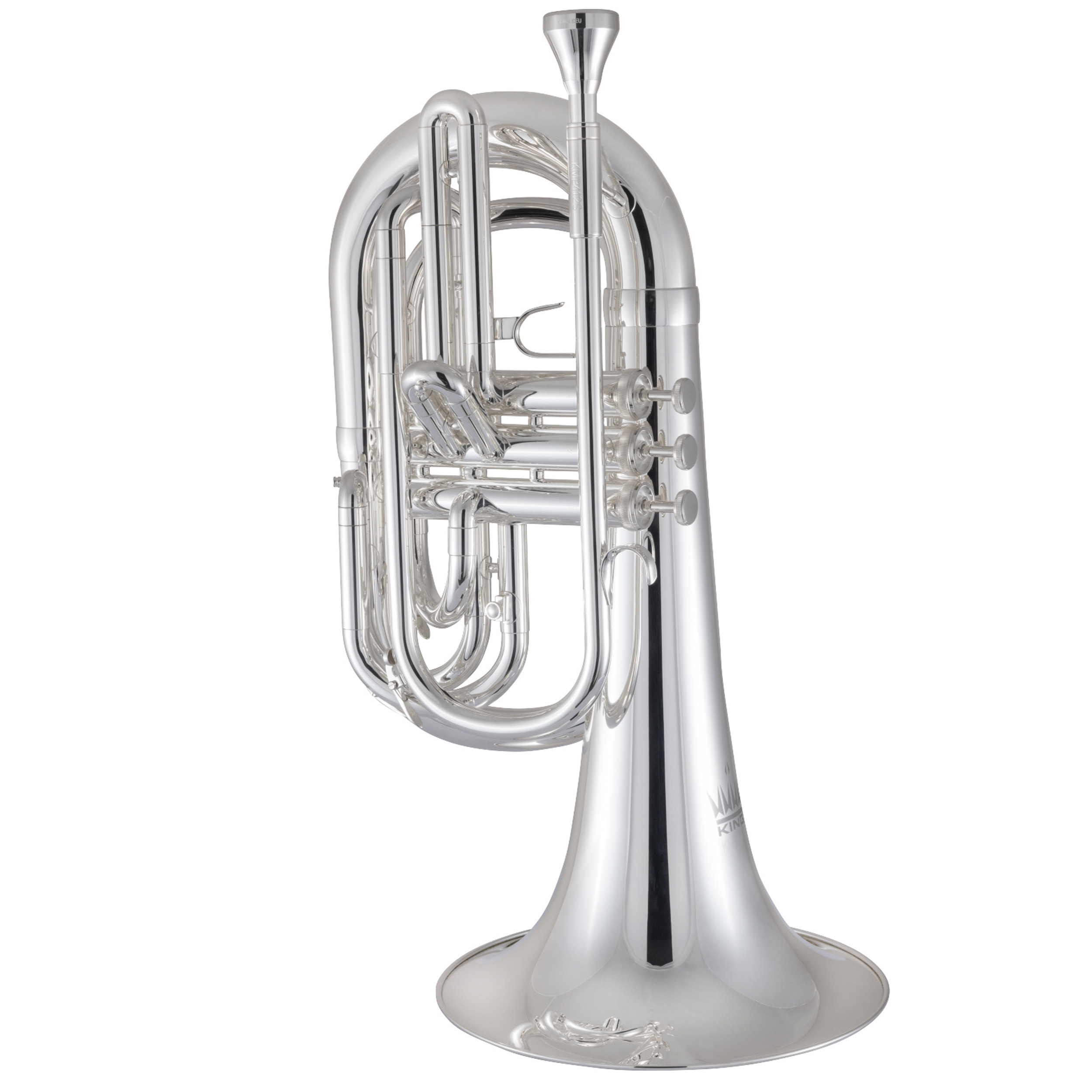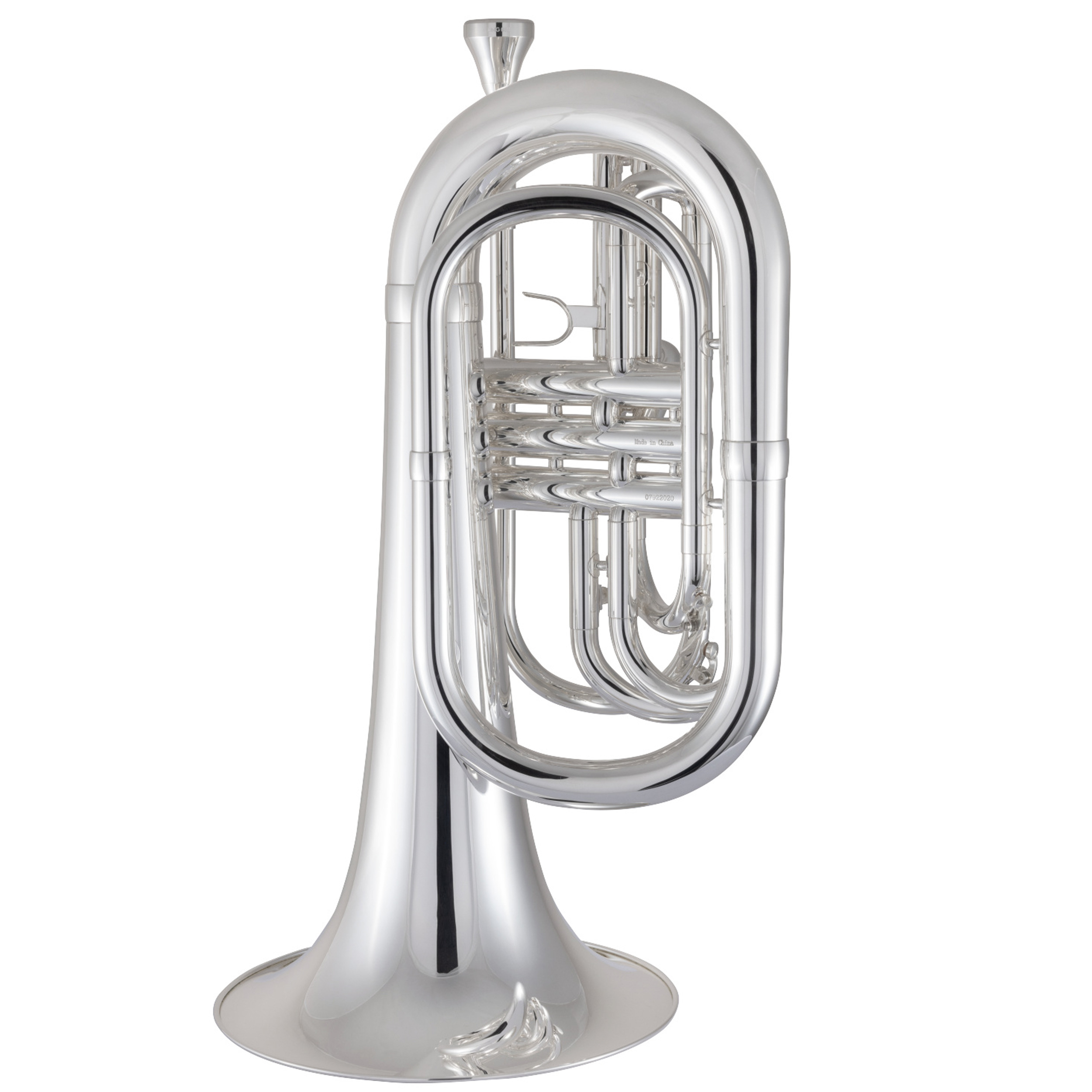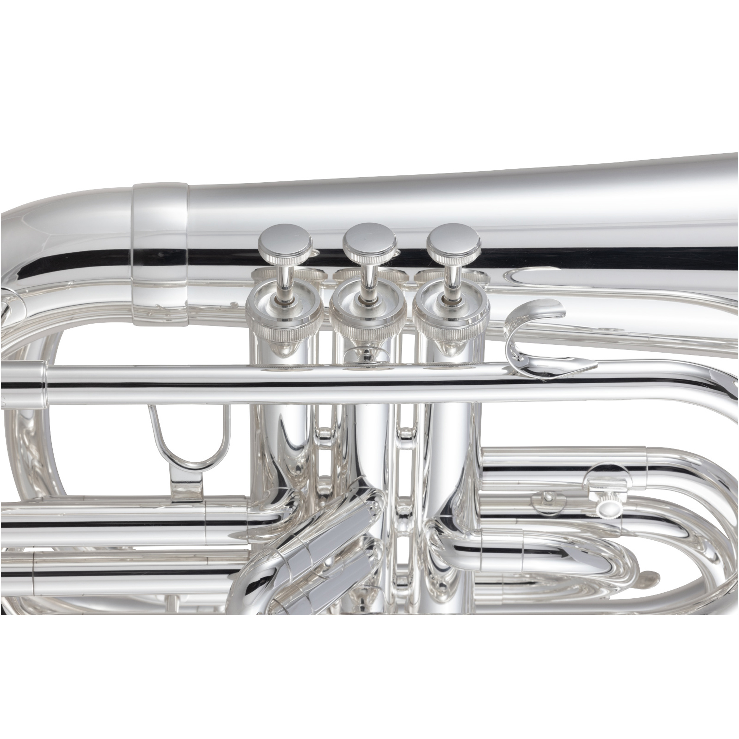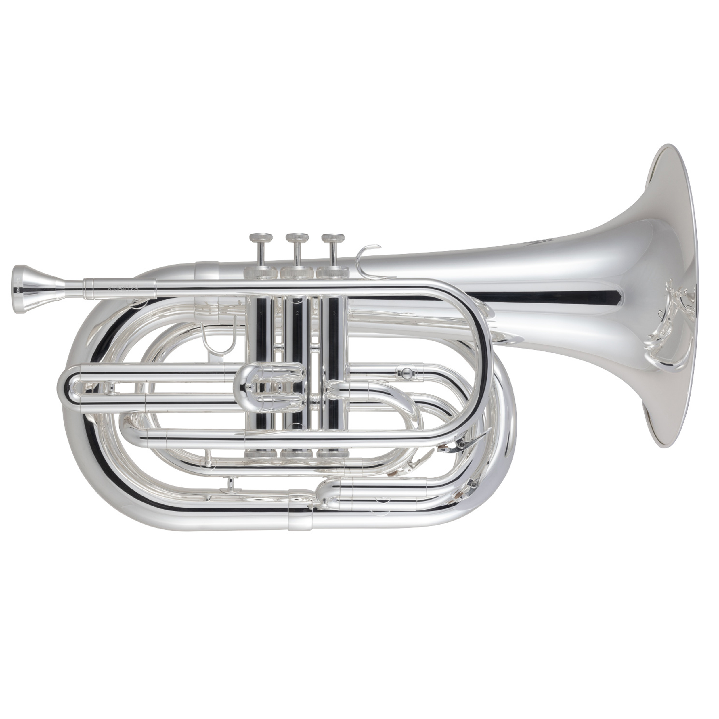 The KMB411 and KMB412 marching baritones were crafted with the help of the World Champion Blue Devils Drum and Bugle Corps. With a rich tenor voice and enhanced ergonomics, the KMB411 and 412 horns are lightweight and well-balanced. The .560" bore, and 10" bell make for a broad and powerful baritone ready for the demands of the marching field. They are available for small shank mouthpieces (KMB411) and large shank (KMB412).