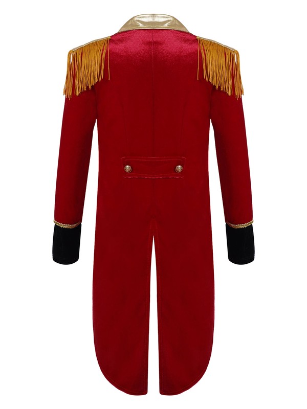 Long sleeves with contrast color cuffs, lapel tail coat, shoulder is adorned with tassels.