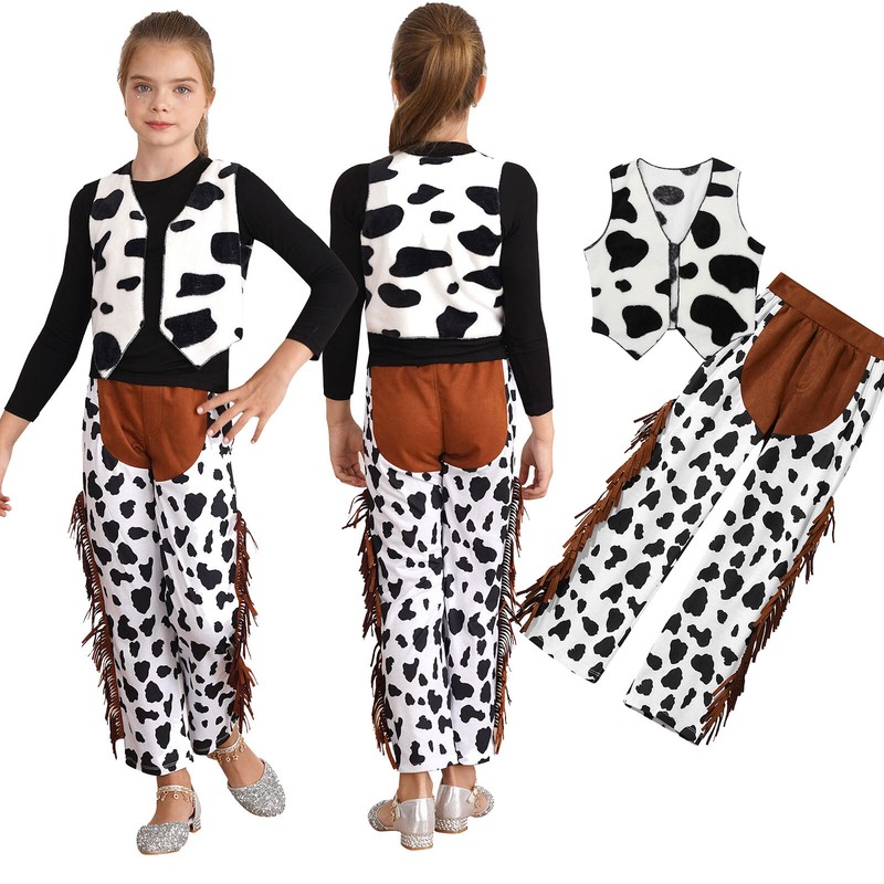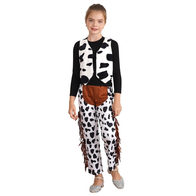 Sleeveless, open front(no fastenings), featuring a black and white cow pattern all over.